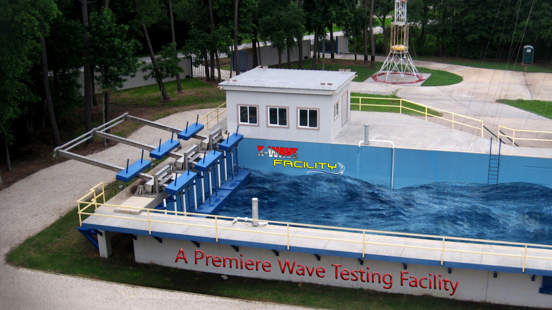 The two above ground buildings are at each end of the pool's deck. One of these facilities is currently serving as a utility workspace and equipment storage area, in the future it will serve as a waiting and elevated observation area and will also store a variety of monitoring equipment and mooring devices to provide X-Wave's clients the ability to modify their testing set ups.
